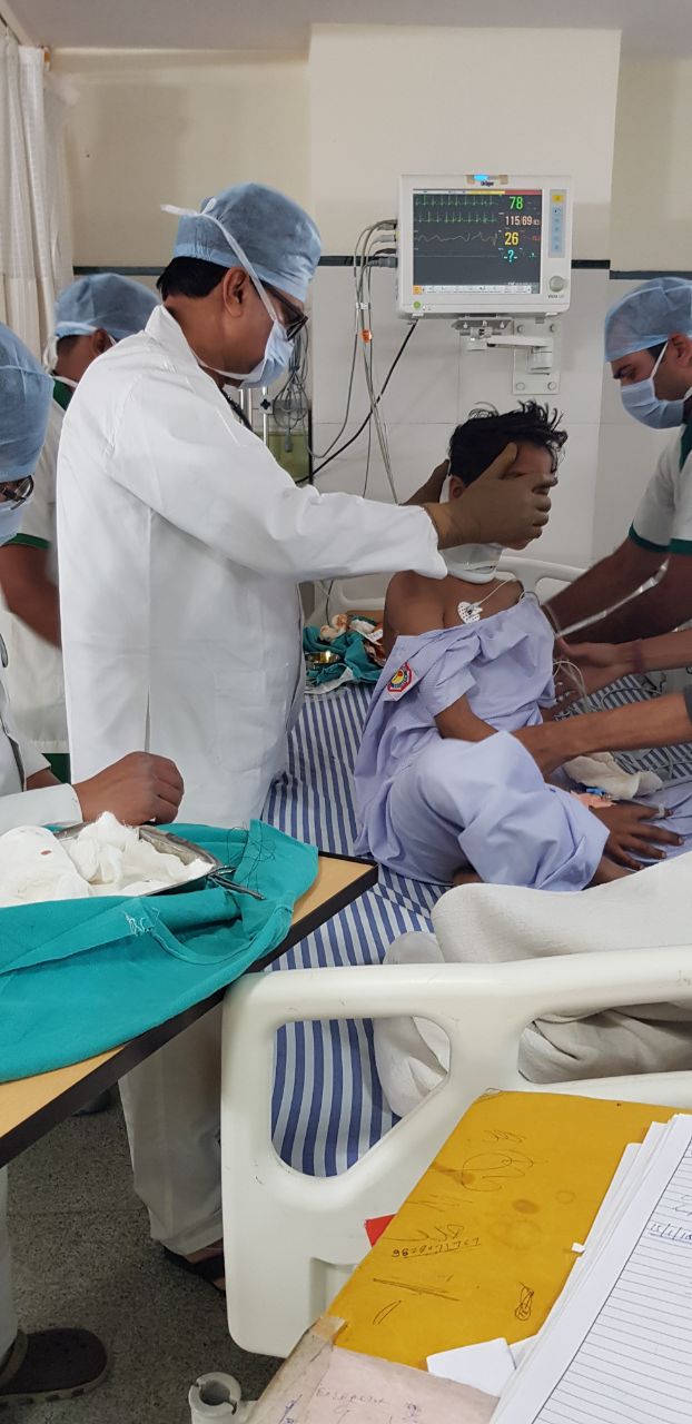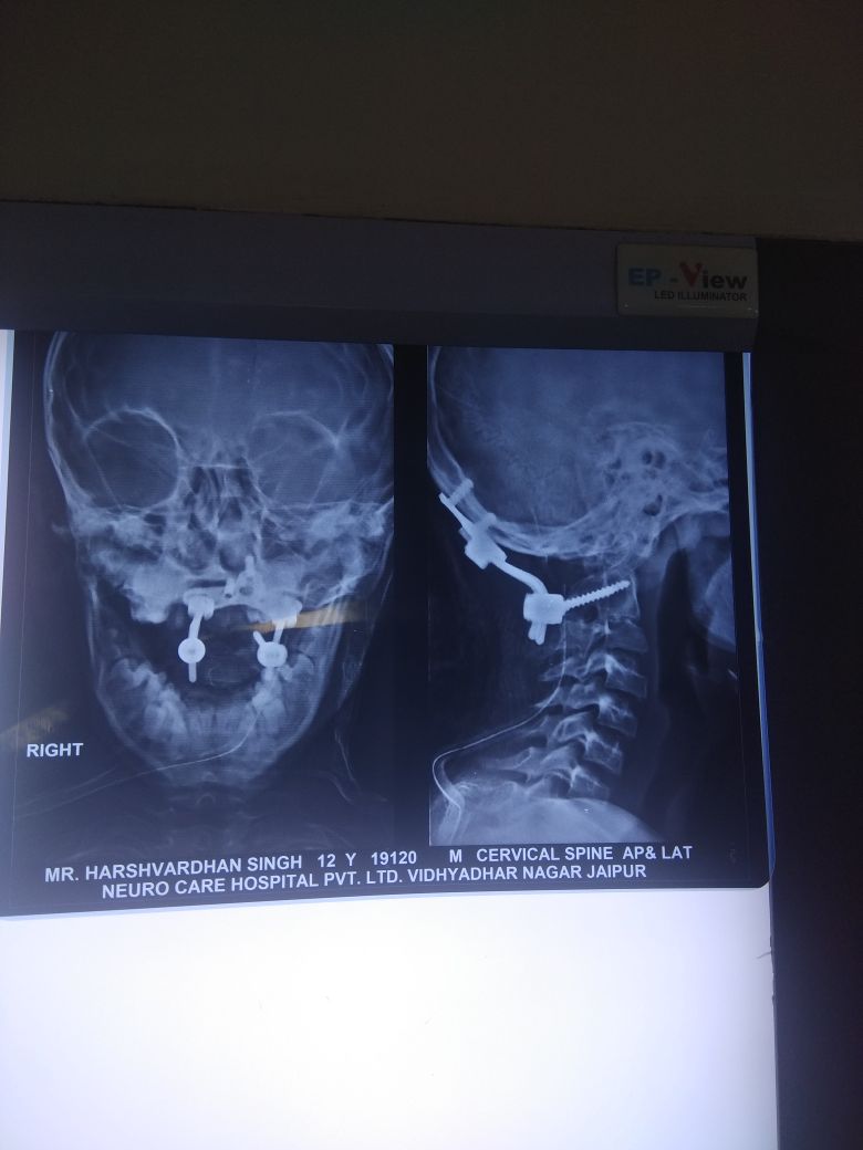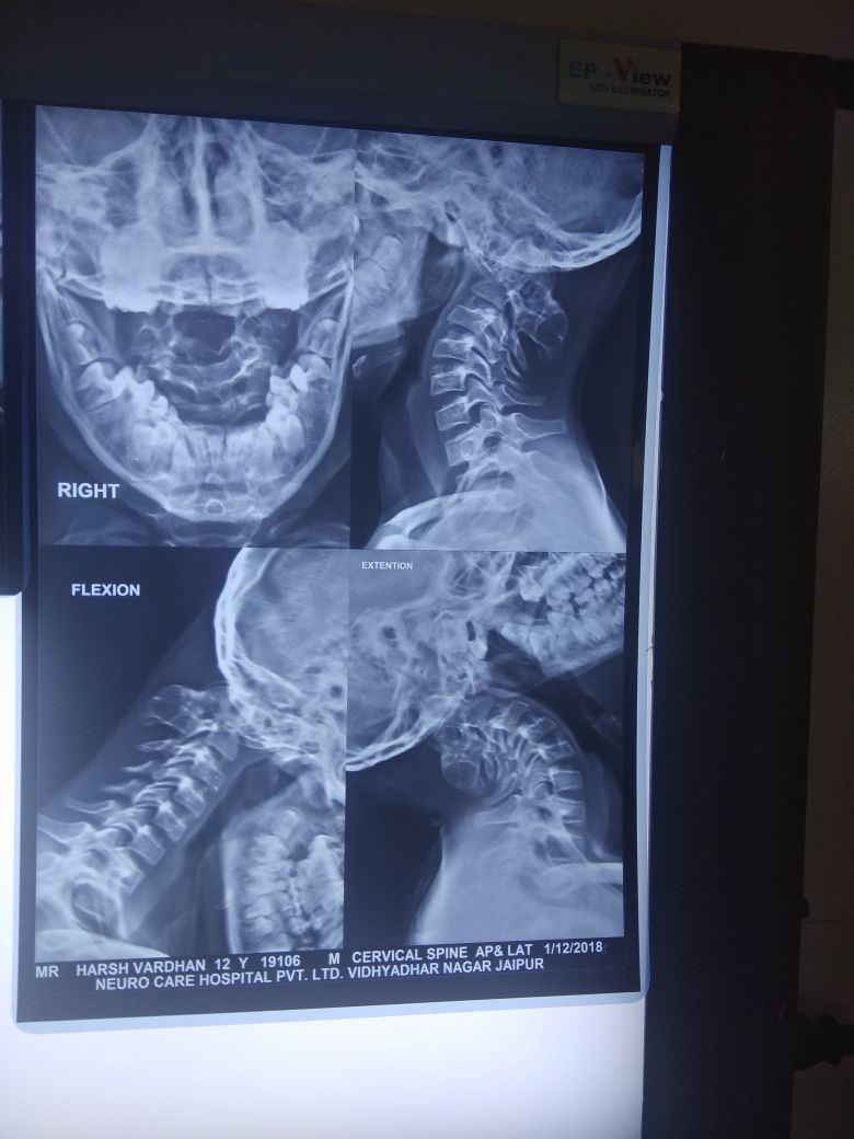 12 Years child Harshvardhan with "Atlanto Axial Dislocation" Treated by Dr. Nemi Chand Poonia (Neurosurgeon) by a critical operation "Occipitocervical Fixation Axial". Now the child is absolutely all right.